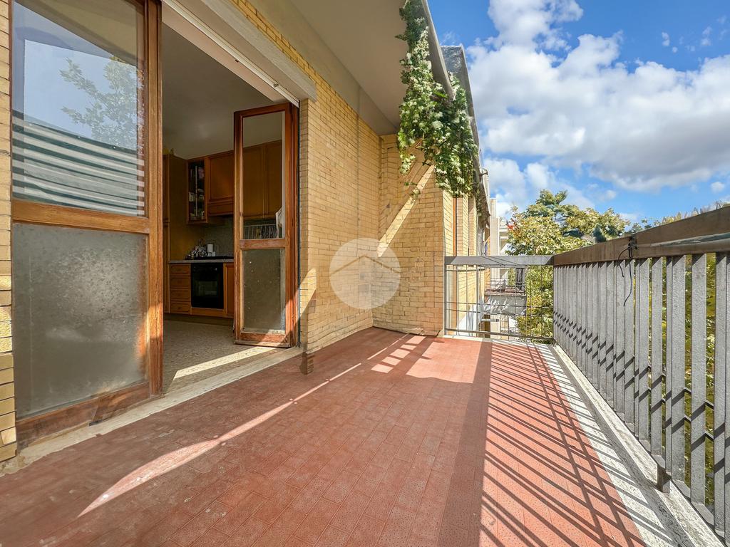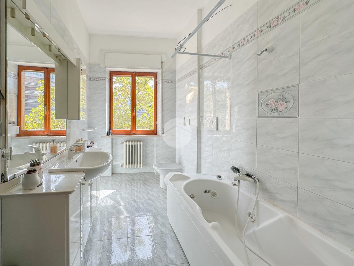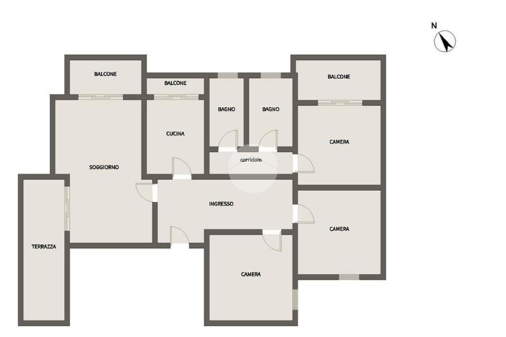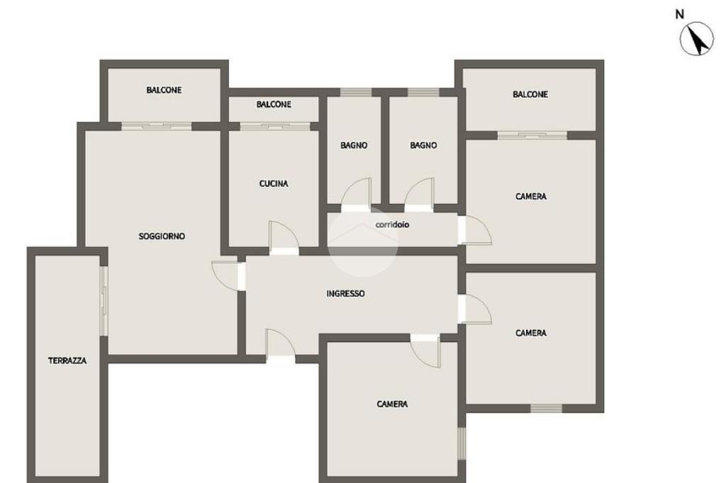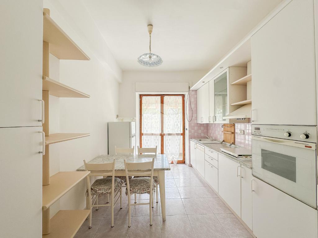 Nella sua disposizione originaria, l’appartamento comprende una cucina con affaccio esterno, un’ampia sala con doppia esposizione, una su balcone e l’altra su un terrazzo, tre camere da letto, di cui una con accesso a un ulteriore balcone, e due bagni entrambi finestrati.