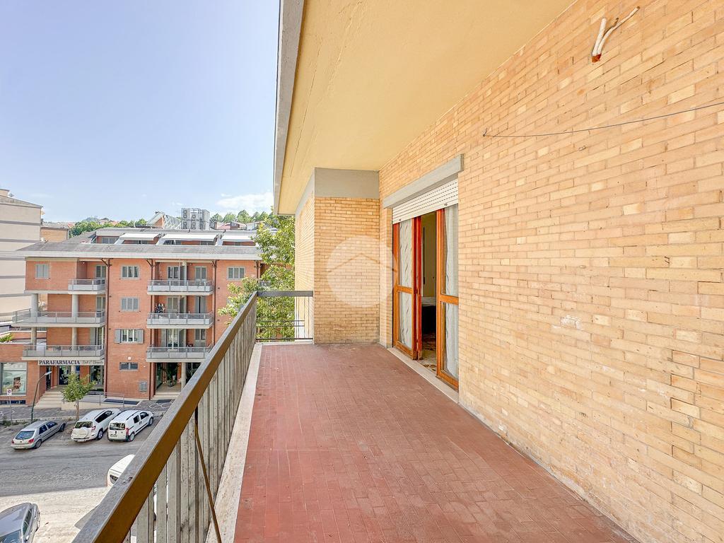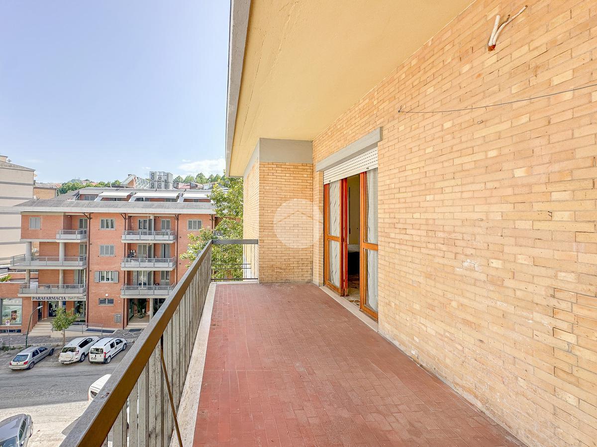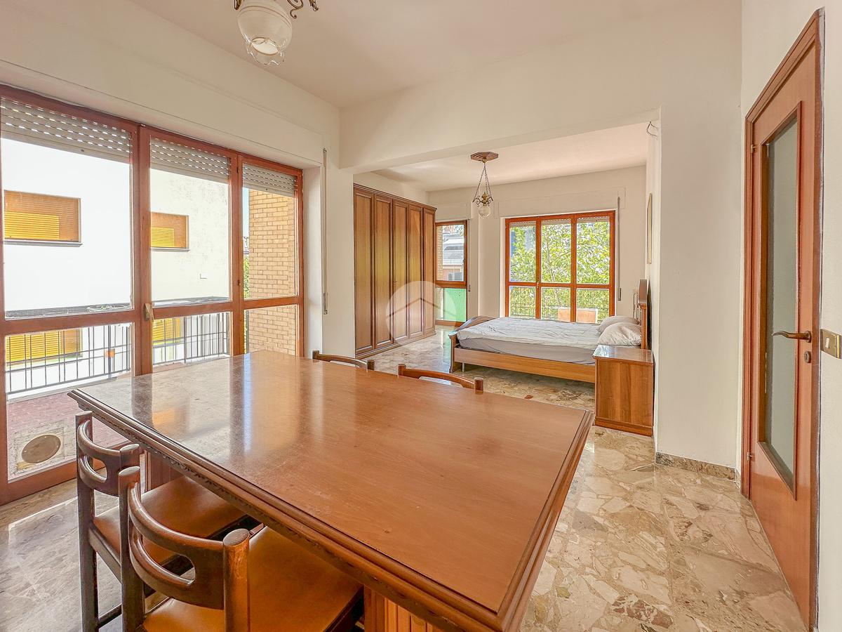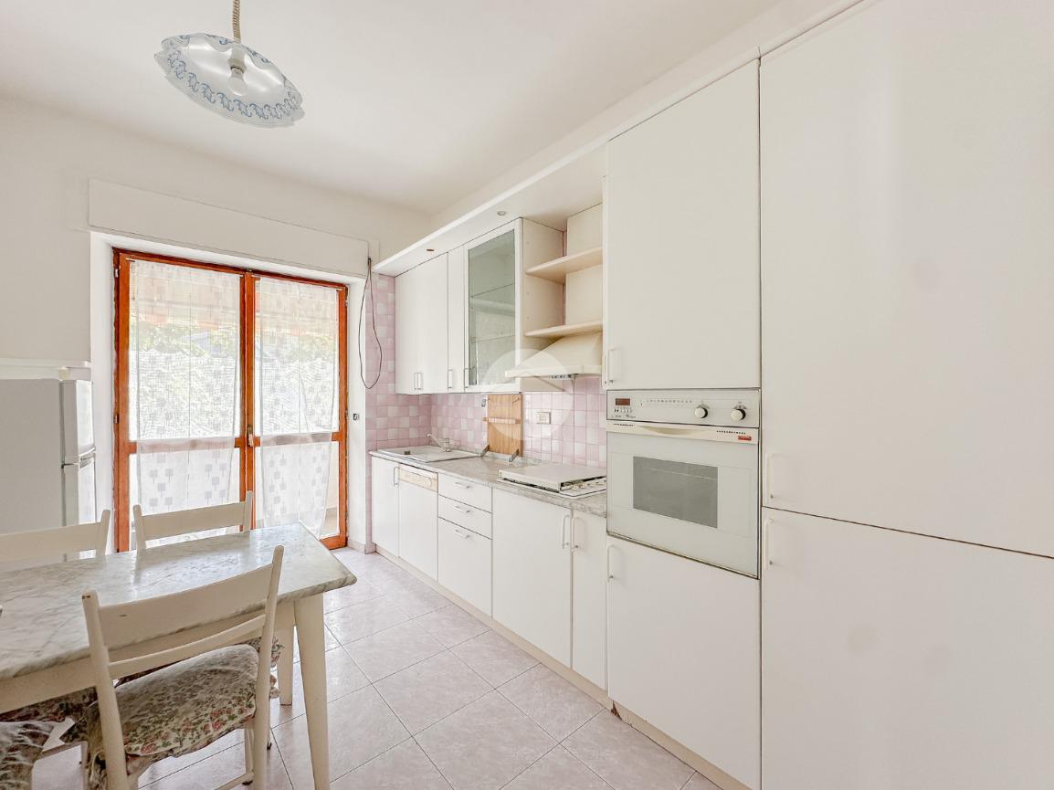Nella sua disposizione originaria, l’appartamento comprende una cucina con affaccio esterno, un’ampia sala con doppia esposizione, una su balcone e l’altra su un terrazzo, tre camere da letto, di cui una con accesso a un ulteriore balcone, e due bagni entrambi finestrati.