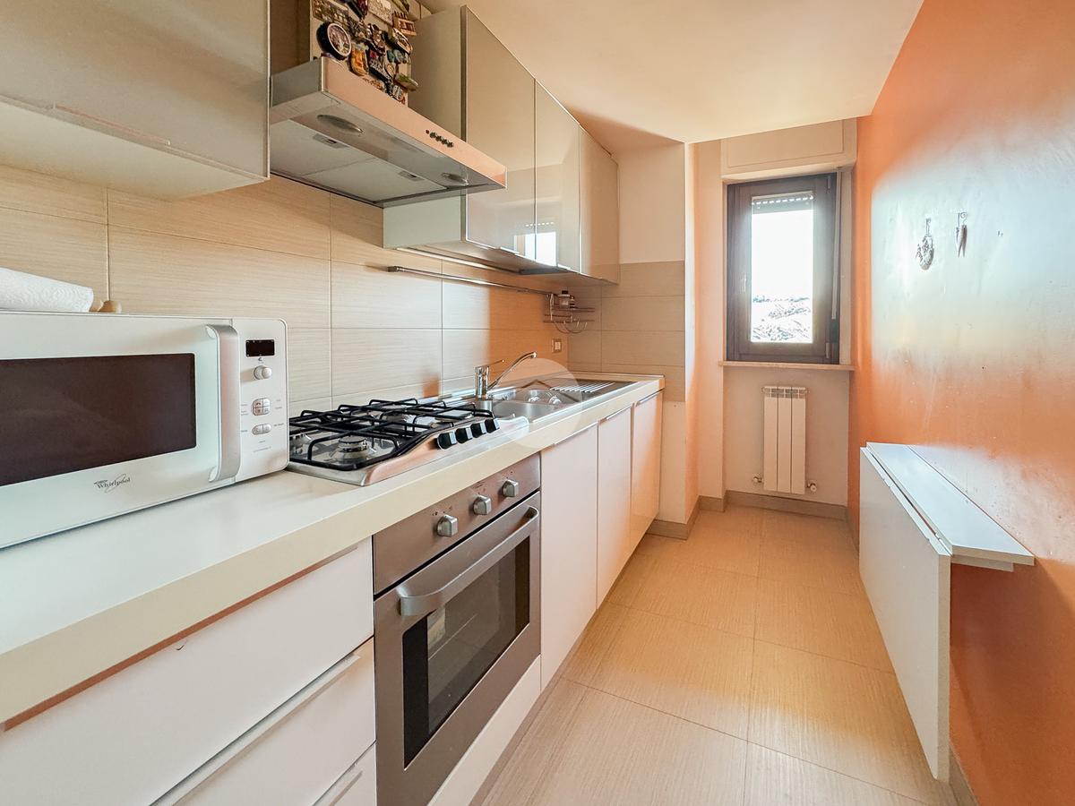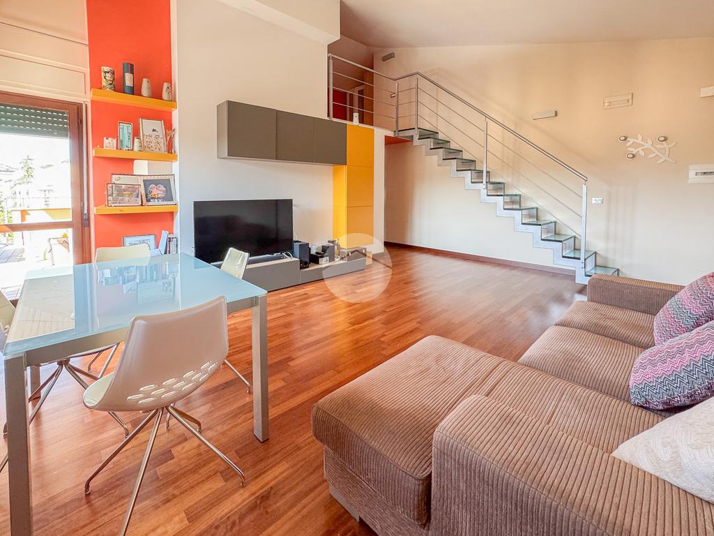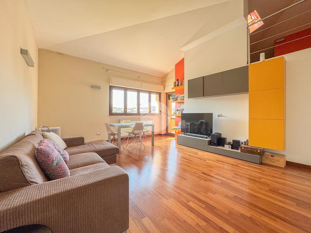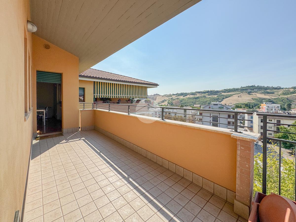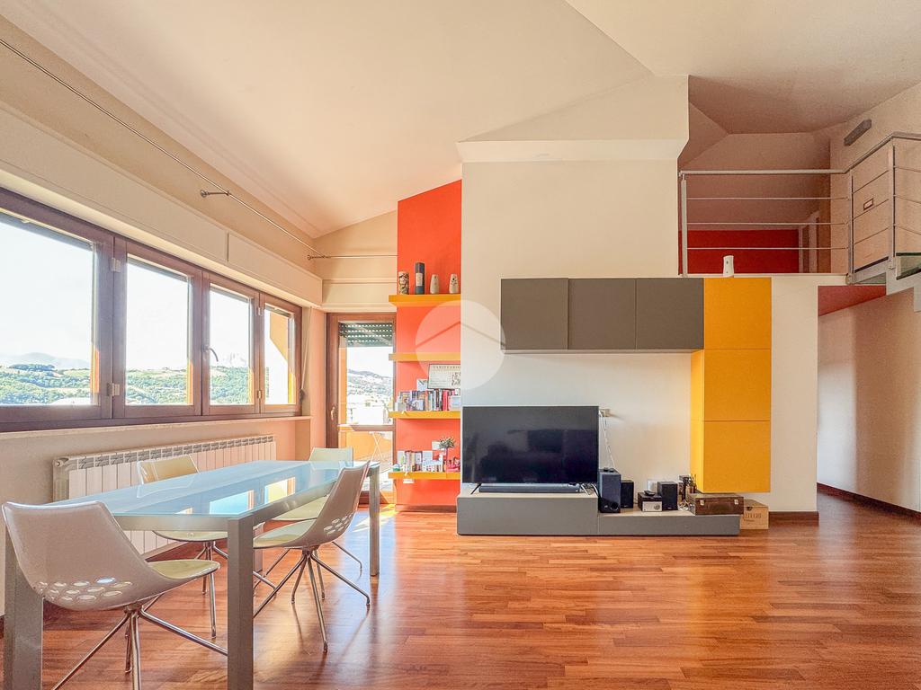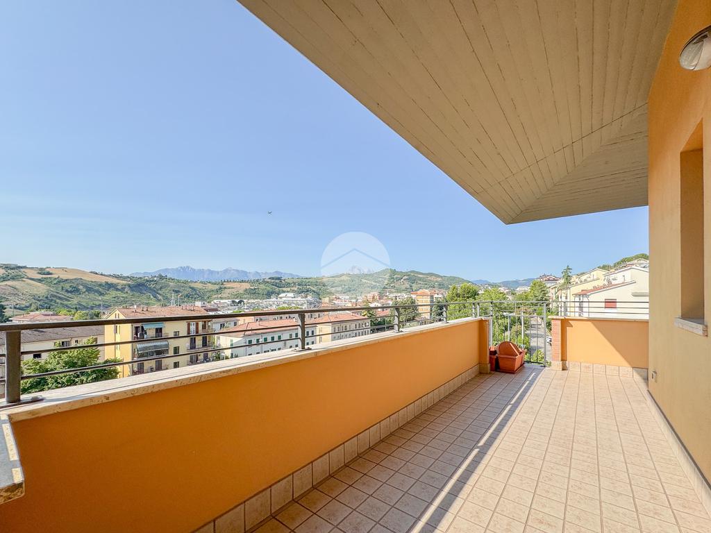 L'immobile è composto da un ingresso che serve direttamente l'ampio e luminoso soggiorno, che affaccia su un terrazzo esclusivo panoramico, dal quale è possibile ammirare sia la città che il Gran Sasso. La cucina è invece abitabile e separata dalla zona living.