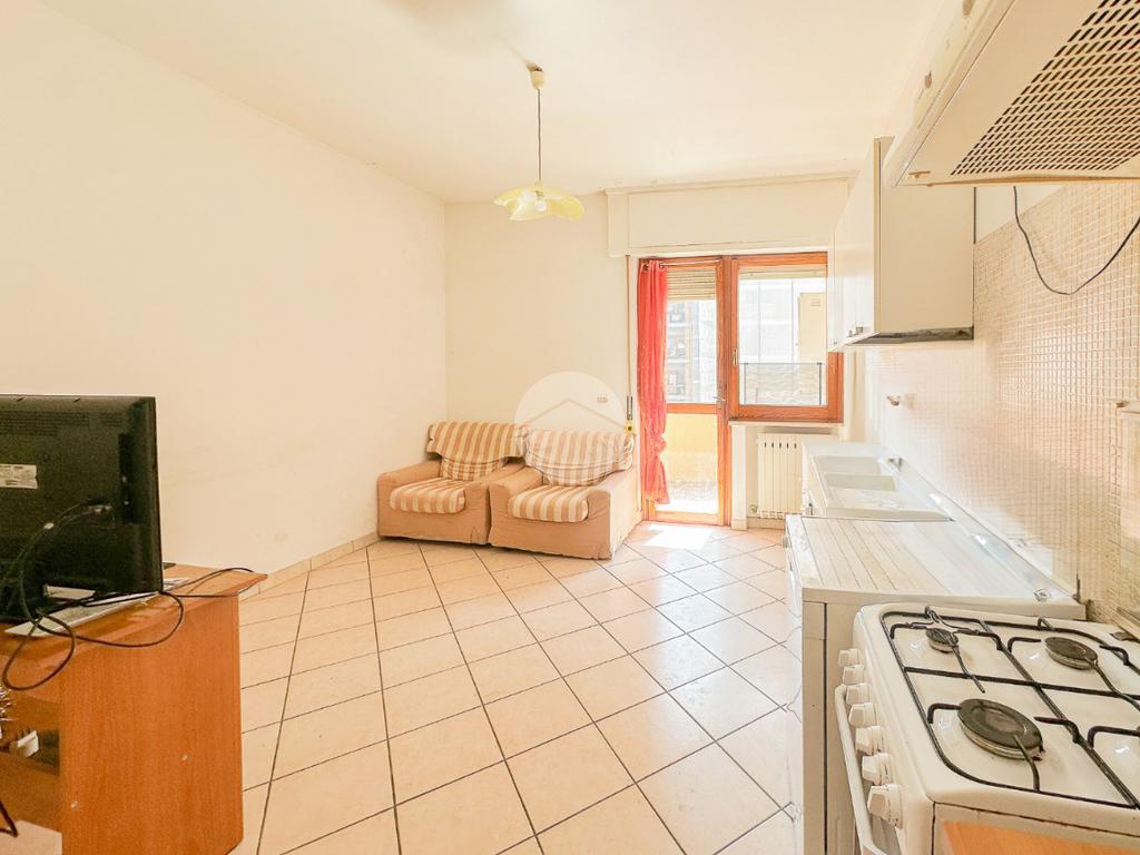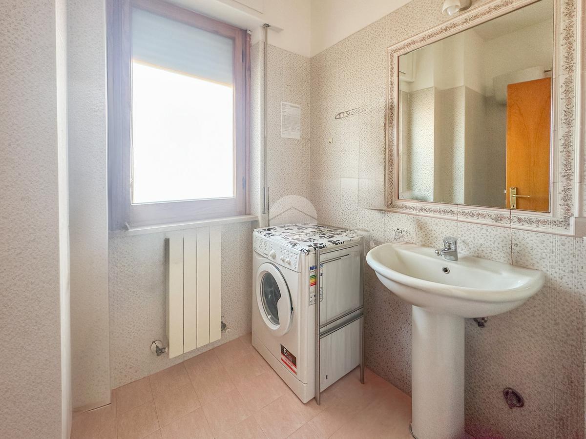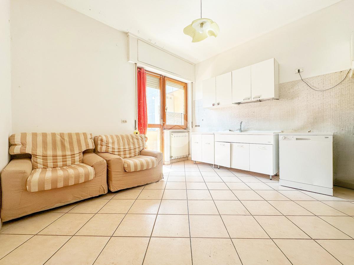 L’ingresso si apre su un luminoso soggiorno con affaccio esterno condiviso con una cucina abitabile dove trova spazio anche un pratico ripostiglio.