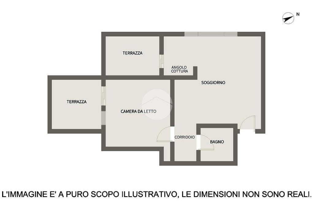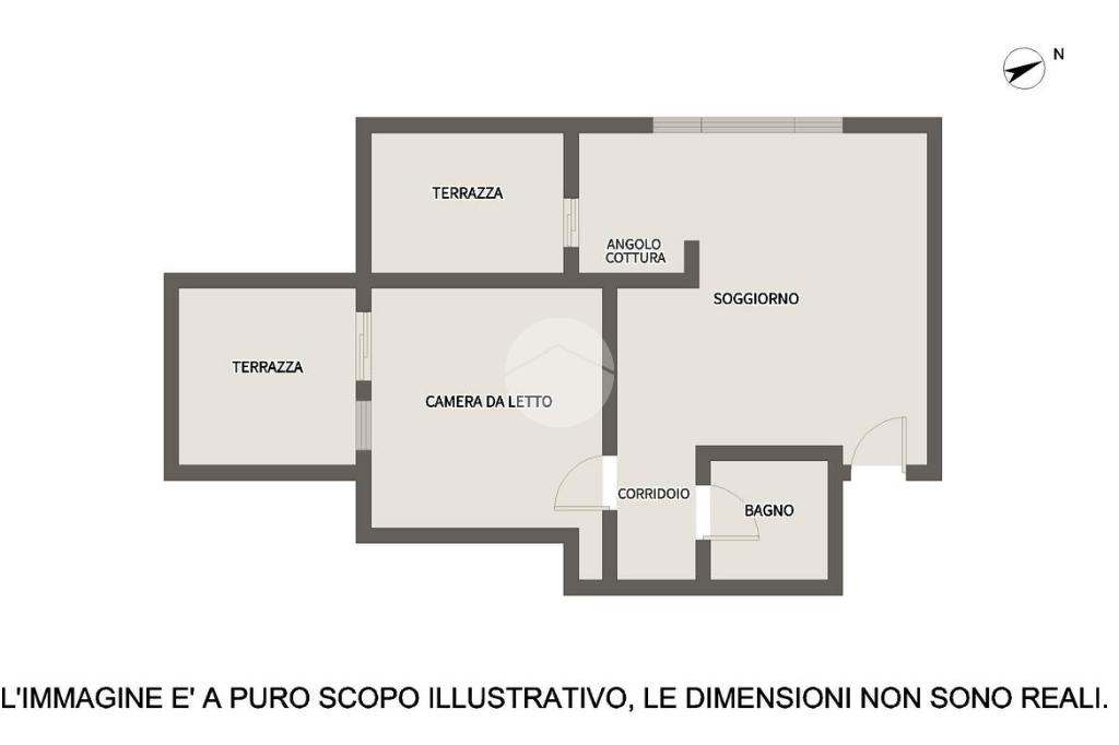 L'appartamento è composto da un ingresso che serve direttamente sull'ampio soggiorno con cucina abitabile e uscita su un terrazzo.
