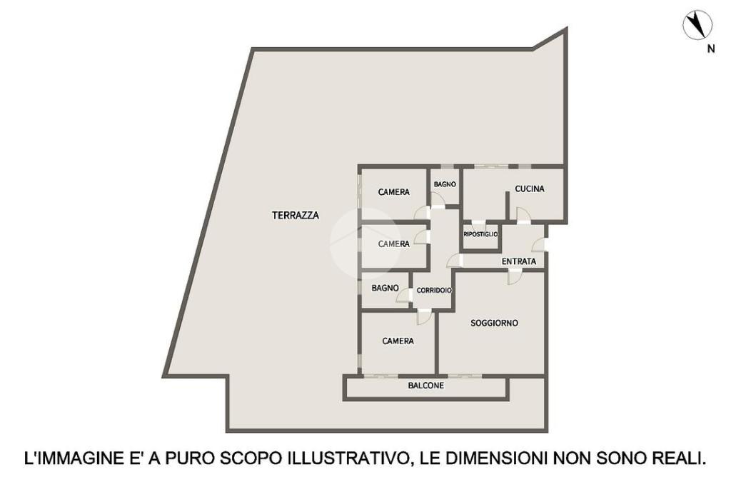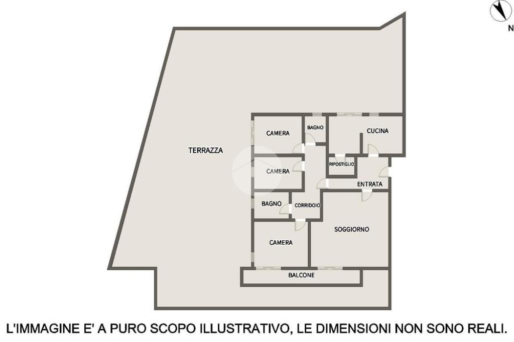 L'appartamento presenta una distribuzione degli spazi interni tipica degli anni di realizzazione, con metrature ampie e comfortevoli. Entrando troviamo subito un accogliente ingresso, che da un lato ci conduce all'ampio soggiorno di 40mq, dall'altro alla cucina abitabile; entrambi hanno l'uscita diretta sul terrazzo esclusivo di 300mq, con vista sul Castello. Un disimpegno separa poi la zona notte, dove troviamo tre comode camere da letto matrimoniali, e due bagni finestrati.