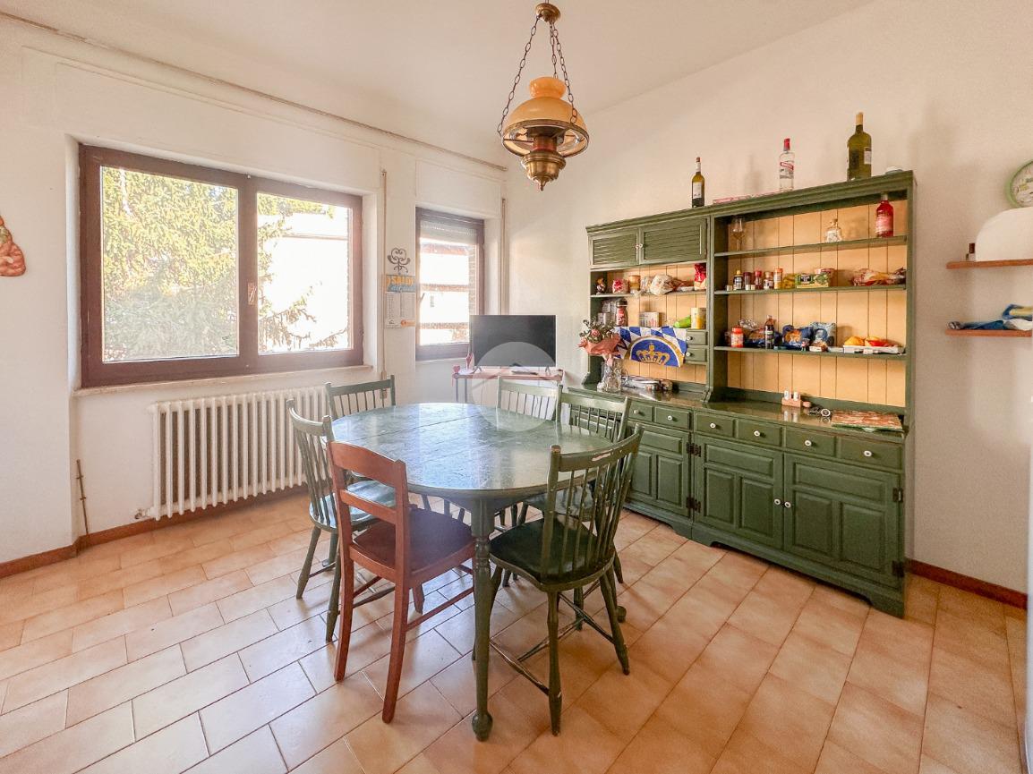 L’ingresso conduce alla zona giorno, composta da un ampio e luminoso soggiorno con camino e accesso al terrazzo, un tinello con uscita sulla veranda e una cucina separata.