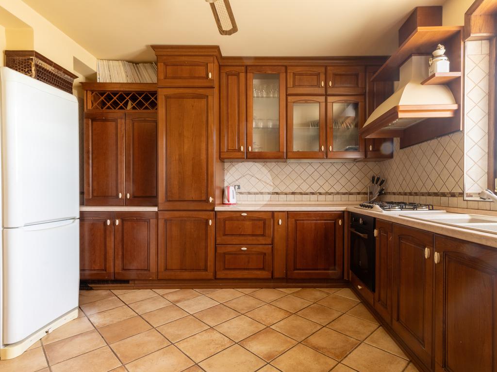 All'interno, il piano superiore ospita una cucina abitabile con affaccio su un terrazzo, un salotto accogliente con zona TV, tre camere da letto, un bagno finestrato con vasca e un bagno di servizio.