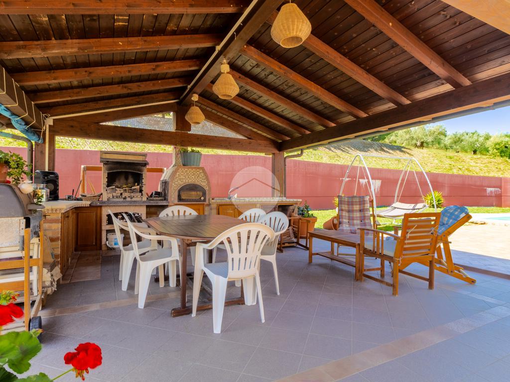 Salendo la scalinata, sia interna che esterna, si giunge al piano superiore dove abbiamo un'ampia corte esterna, metà pavimentata e metà giardino, con un'accogliente area relax. Protetta da una tettoia in legno, questa zona è ideale per godere di momenti all'aperto, grazie a un barbecue perfetto per le cene estive e una piscina che offre un angolo perfetto per rilassarsi.